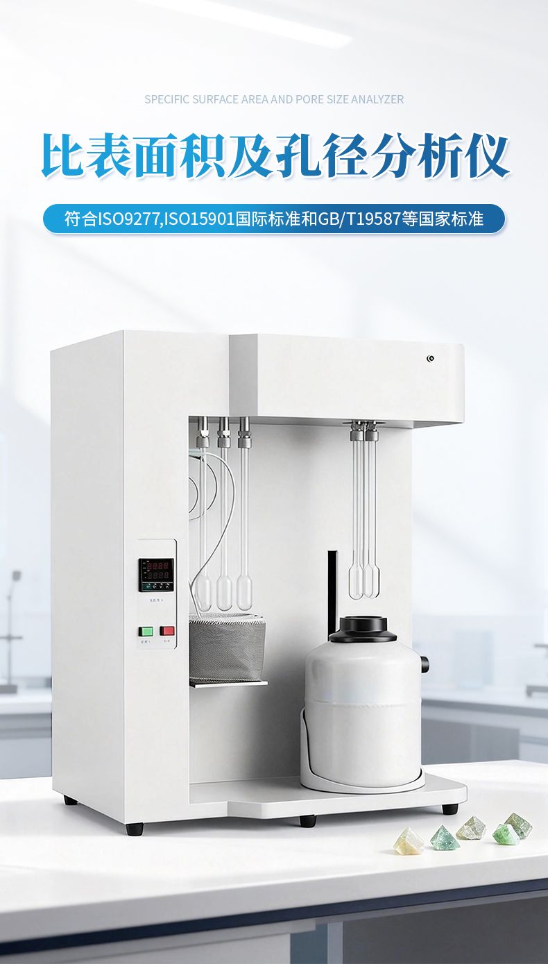 全自動比表面積及孔隙度分析儀符合ISO9277,ISO15901國際標準和GB/T19587等國家標準,依據靜態容量法通過質量平衡方程,靜態氣體平衡和壓力測定來測試吸附過程。測試過程在液氮溫度下進行。已知量氣體由歧路充入樣品管后,會引起壓力下降,由此計算吸附平衡時被吸附氣體的摩爾質量。通過測定出該平衡吸附量,利用理論模型來求出被測樣品的單點、多點BET比表面積,Langmuir比表面積;BJH中孔、大孔體積、面積分布,總孔體積;t―plot微孔體積和表面積,Dubinin―Astakhov微孔分布,Horvath―Kawazoe、SF微孔分布,MP微孔分布;非局域密度函數理論(NLDFT)和蒙特卡洛(GCMC)孔徑分布模型等參數。