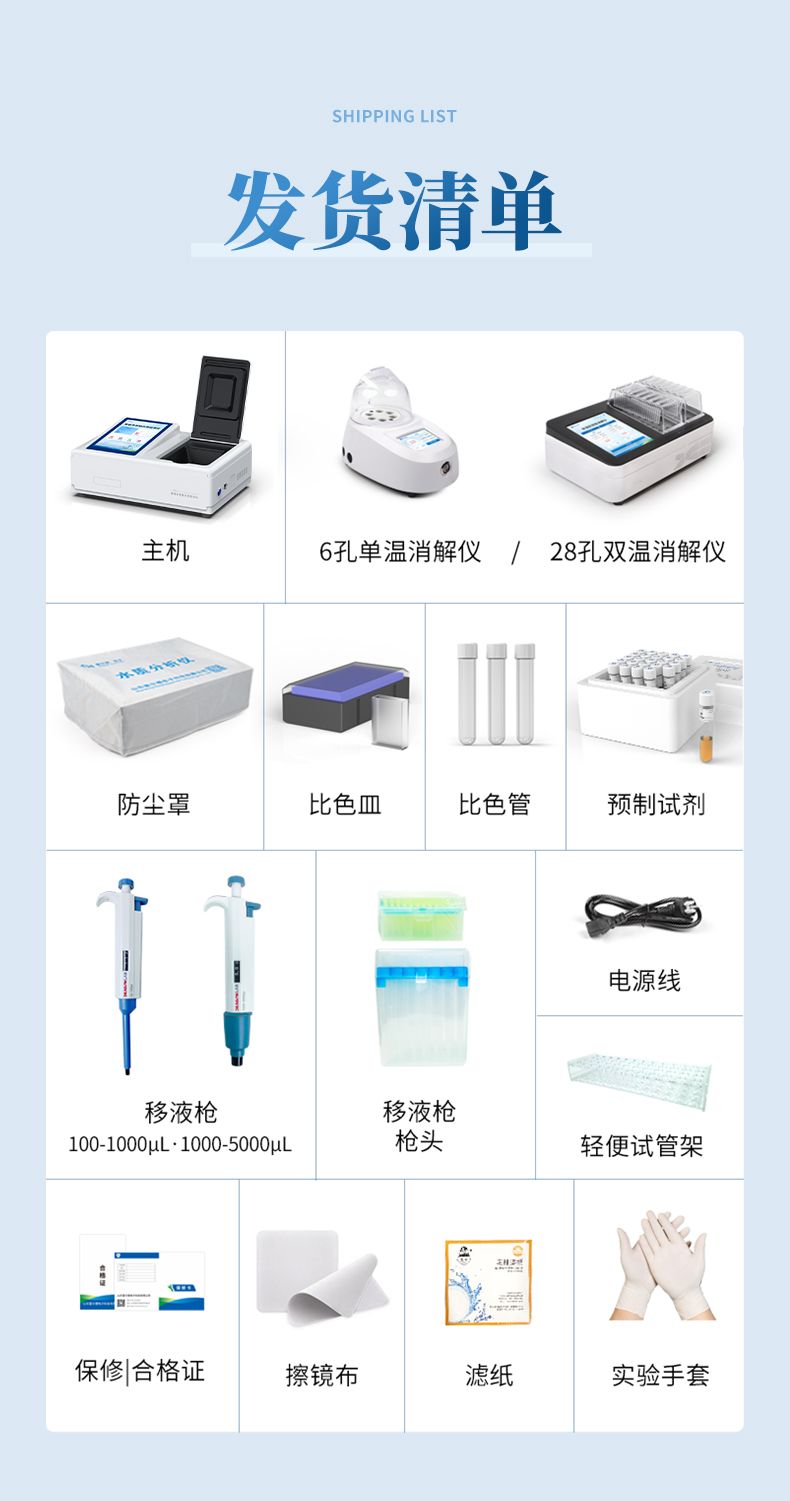 檢測儀主機x1,6孔消解儀x1,比色管夾具x1,數據線x1,充電器x1,高錳酸鹽指數預制試劑x1,5ml移液器x1,1ml移液器x1,5ml槍頭盒x1,1ml槍頭盒x1,冷卻試管架x1,比色瓶x8,比色管x4,濾紙x1,擦鏡布x2,丁腈手套x1,手提配件箱x1,說明書x1,合格證/保修卡x1,藍牙打印機x1(選配)。