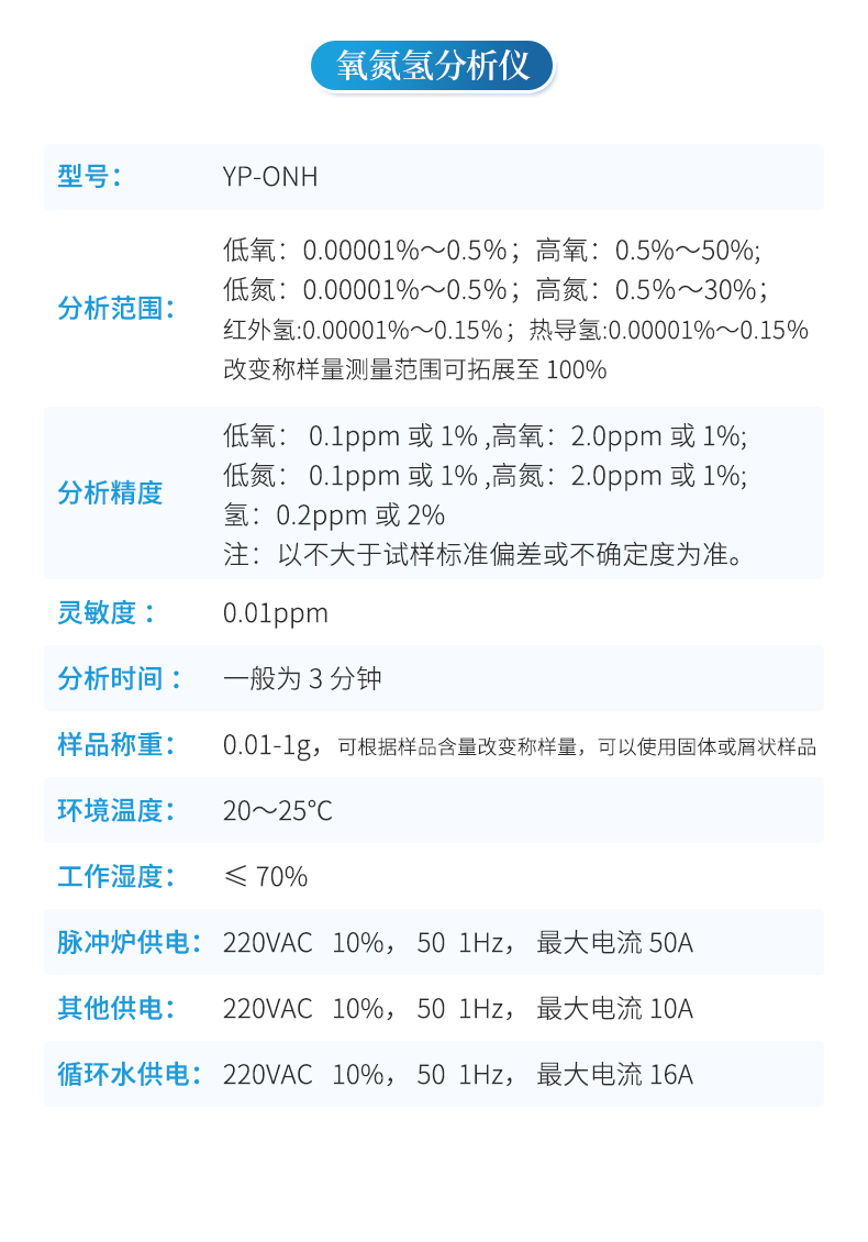 1、氧分析采用非色散紅外檢測系統;氮分析采用高精度熱導檢測系統;氫分析采用非色散紅外檢測系統或者高精度熱導檢測系統。