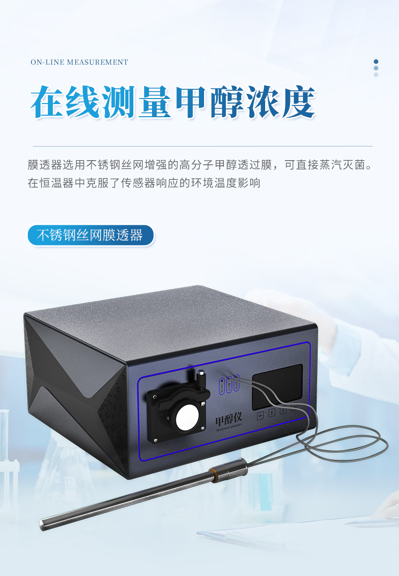 在線測(cè)量發(fā)酵液中甲醇濃度,膜透器選用了不銹鋼絲網(wǎng)增強(qiáng)的高分子甲醇透過膜,可直接蒸汽滅菌。檢測(cè)傳感器工作在恒溫器中克服了傳感器響應(yīng) 的環(huán)境溫度影響,脫透器有φ25和φ12mm插入直徑可選,和有多種插入長(zhǎng) 度可選,儀器具有非線性校正,程控標(biāo)定,高低位報(bào)警,數(shù)字溫度補(bǔ)償和兩級(jí)密碼保護(hù)重要數(shù)據(jù)及菜單組態(tài)等功能