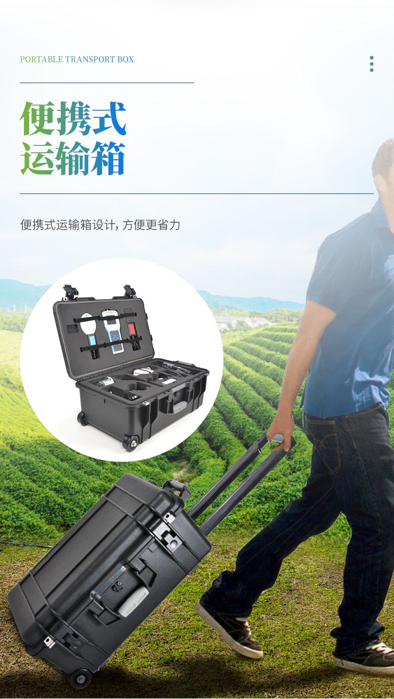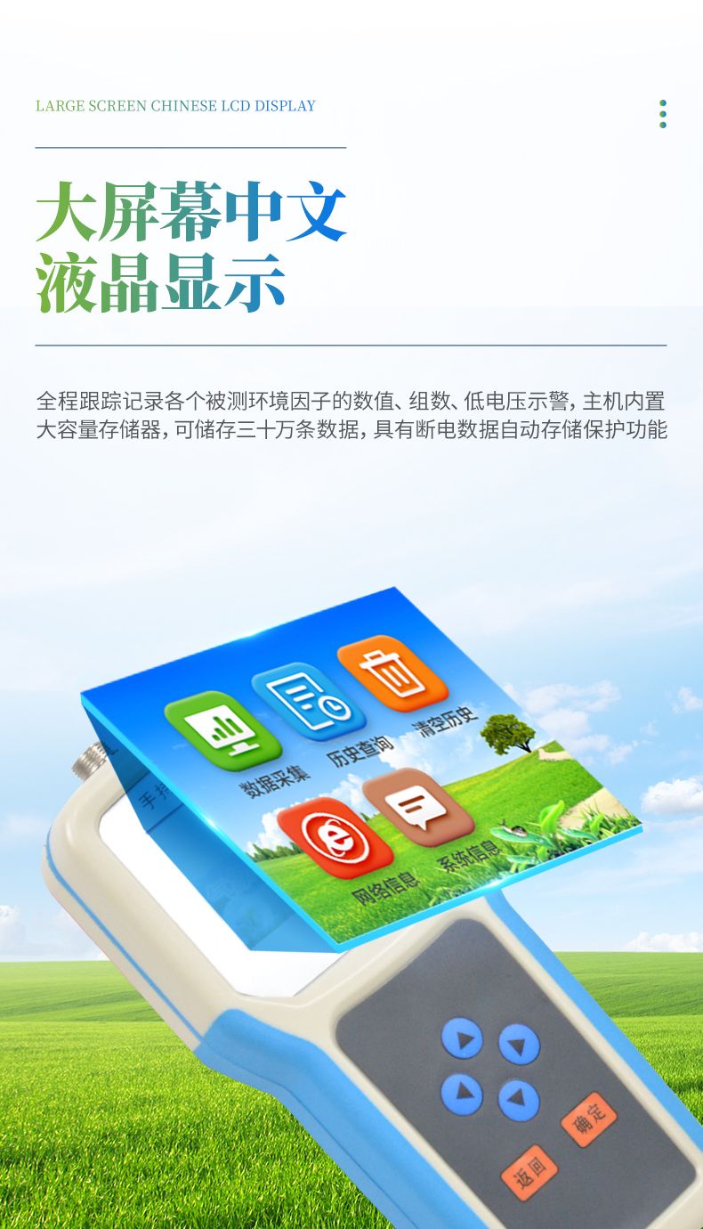 手持式智能農業氣象環境檢測儀是我們專門針對農田、草場局部小尺度環境設計的,對與植被和農作物生長密切相關的土壤、水氣等環境參數監測的農田小氣候站。它主要觀測與農業相關的空氣溫度、空氣濕度、光照強度、二氧化碳濃度、露點溫度、光合有效輻射、土壤溫度、土壤水分、土壤鹽分、土壤PH、風速、風向等12個環境參數氣象要素,為農業科研、農業生產等提供良好的支持。