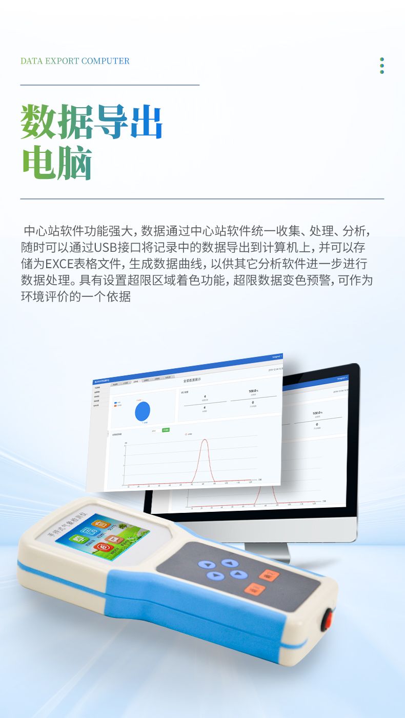 采用一體化結構設計,內置GPS模塊,GPRS模塊,外置SD卡,能準確的測量出被測地點的地理信息,界面除顯示所測環境參數、存儲數據外,還可顯示測點的經緯度。通過內置的GPRS一鍵上傳被測點的環境因子測量數據等。同時還可以通過外置SD卡直接把數據導出到電腦上。(可選)