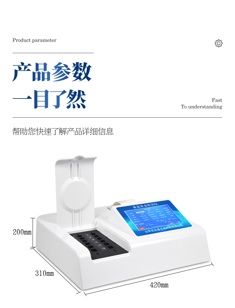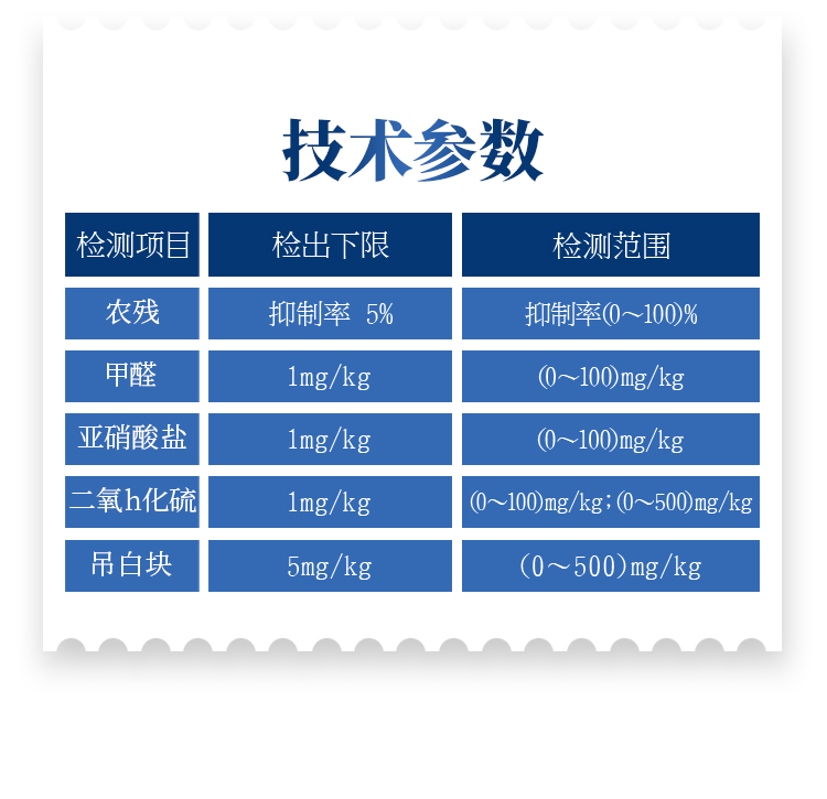 可快速檢測各類食品中的甲醛、二氧化硫、亞硝酸鹽、吊白塊的含量,儀器預留其他項目檢測程序和端口,根據日后需求可方便的自主增加檢測項目。