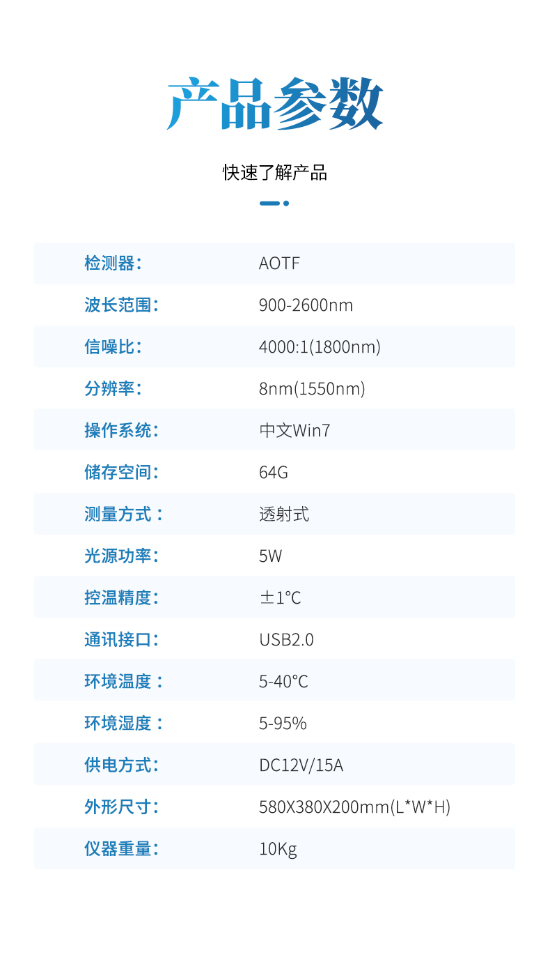 采用新型的AOTF 聲光可調檢測技術,整機設計 小巧緊湊,安裝快捷,操作簡單,配有外置熔樣和內置恒溫裝置,進行快速 無損的定量檢測,在化工、制藥、軍工等行業有著廣泛應用。