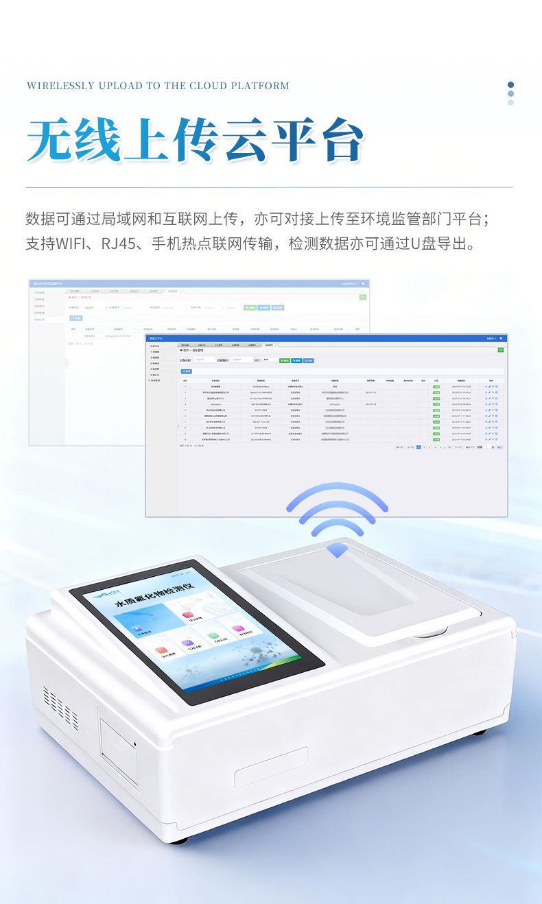 8.儀器帶有監(jiān)管云平臺(tái),數(shù)據(jù)可通過局域網(wǎng)和互聯(lián)網(wǎng)上傳,亦可對接上傳至環(huán)境監(jiān)管部門平臺(tái)。