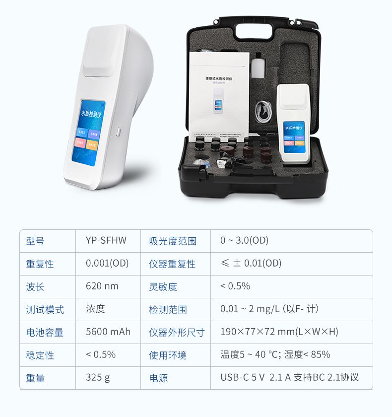 【產品簡介】手持式;檢測范圍:0.01 ~ 2 mg/L(以F- 計);吸光度范圍:0 ~ 3.0(OD)