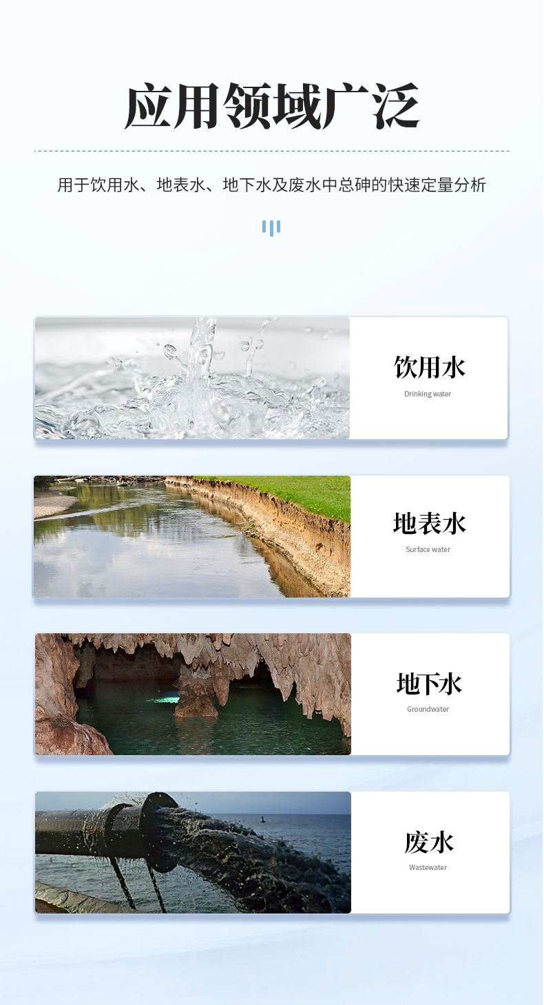 本儀器基于分光光度法原理,專門用于各類水體中總砷的定量檢測,其測量范圍覆蓋0.01mg/L至0.50 mg/L。該儀器適用于環境監測領域對地表水、地下水的基礎調查與常規監測;是水務部門對飲用水源、出廠水及管網末梢水進行砷含量安全篩查的可靠工具;同時可應用于工業廢水、生活污水等排放口水樣的合規性檢測(復雜樣品需經標準消解預處理)。此外,在農業灌溉水水質評估、第三方檢測實驗室的批量分析、科研機構的項目研究以及應急污染事件的現場快速排查等場景中,本儀器均能提供準確、便捷的檢測支持。其方法符合國家標準核心原理,操作簡便,結果穩定,是環保、衛生、水務、工礦企業及科研教育機構進行水質砷分析的理想選擇。