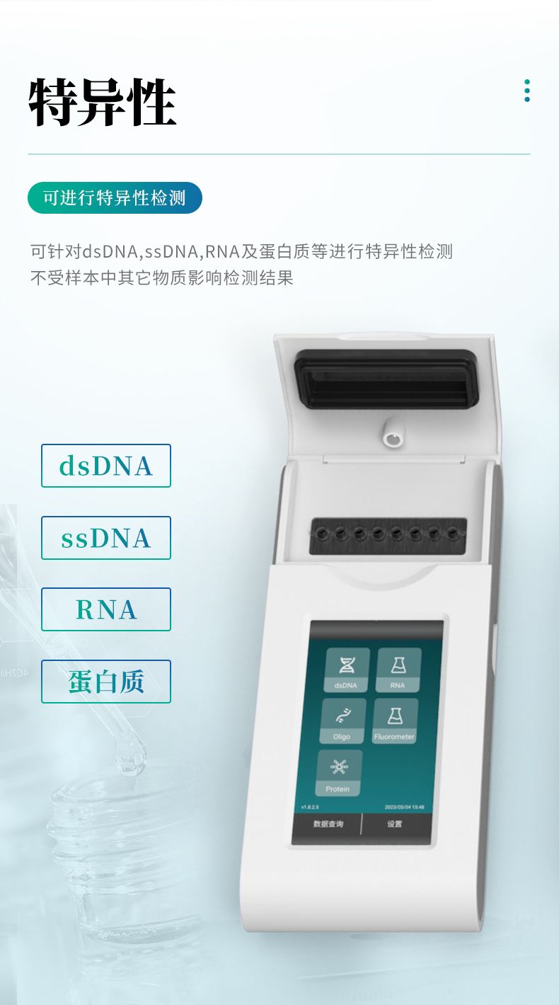 特異性---可針對dsDNA,ssDNA,RNA及蛋白質等進行特異性檢測,不受樣本中其它物質影響檢測結果
