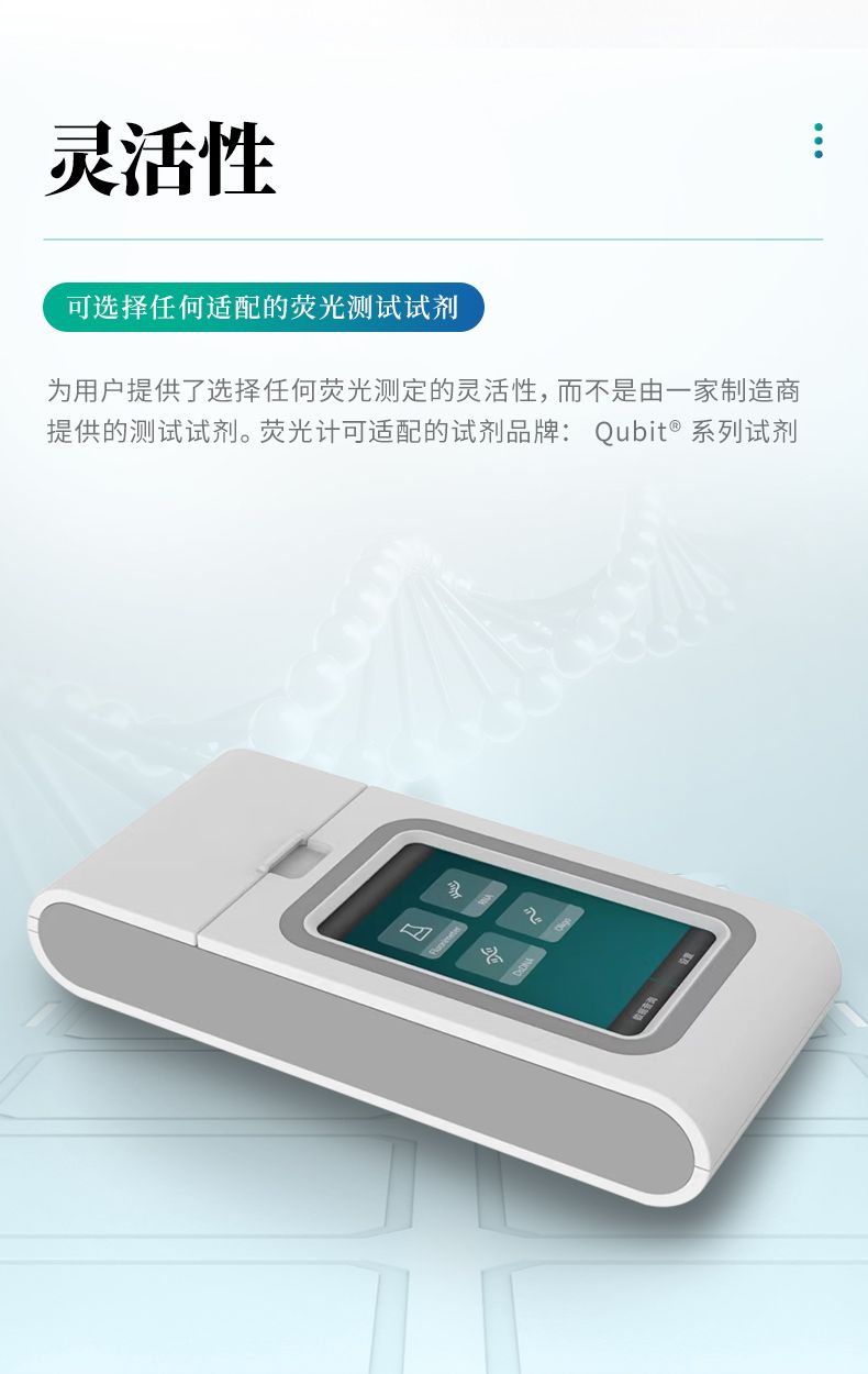靈活性---為用戶提供了選擇任何熒光測定的靈活性,而不是由一家制造商提供的測試試劑。熒光計可適配的試劑品牌: Qubit? 系列試劑.